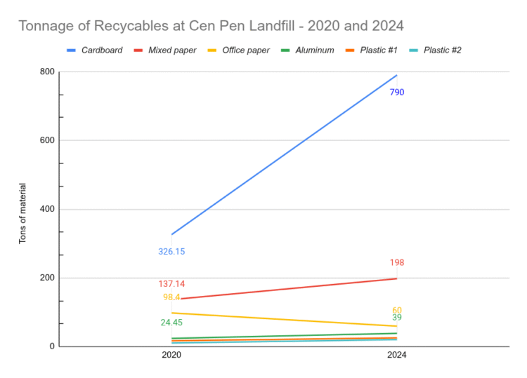 Although it is important to recycle, aluminum is far from the Borough’s largest volume of recyclable material. The landfill received 790 tons of cardboard in 2024—more than double the 326.25 tons it received in 2020. The surge of cardboard follows a national trend driven by online retail companies, like Amazon, delivering their products in cardboard packaging. In addition to consuming landfill volume, cardboard and other woodpulp products buried in landfills can decompose into methane, a greenhouse gas many times more potent than CO2